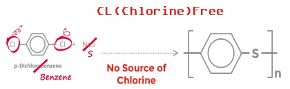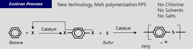 ECOTRAN is manufactured by using Benzene and Sulfur without any chloride compounds. Unlike the conventional PPS, Ecotran is produced by eco-friendly manufacturing process that generates significantly less by-product.