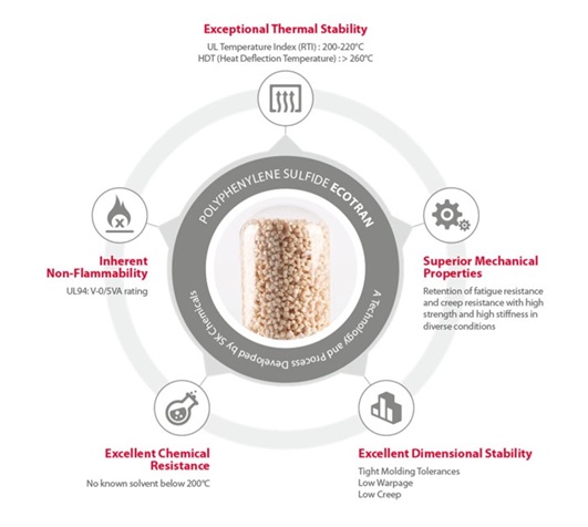 Ecotran is similar to conventional PPS in mechanical, thermal and electrical properties.